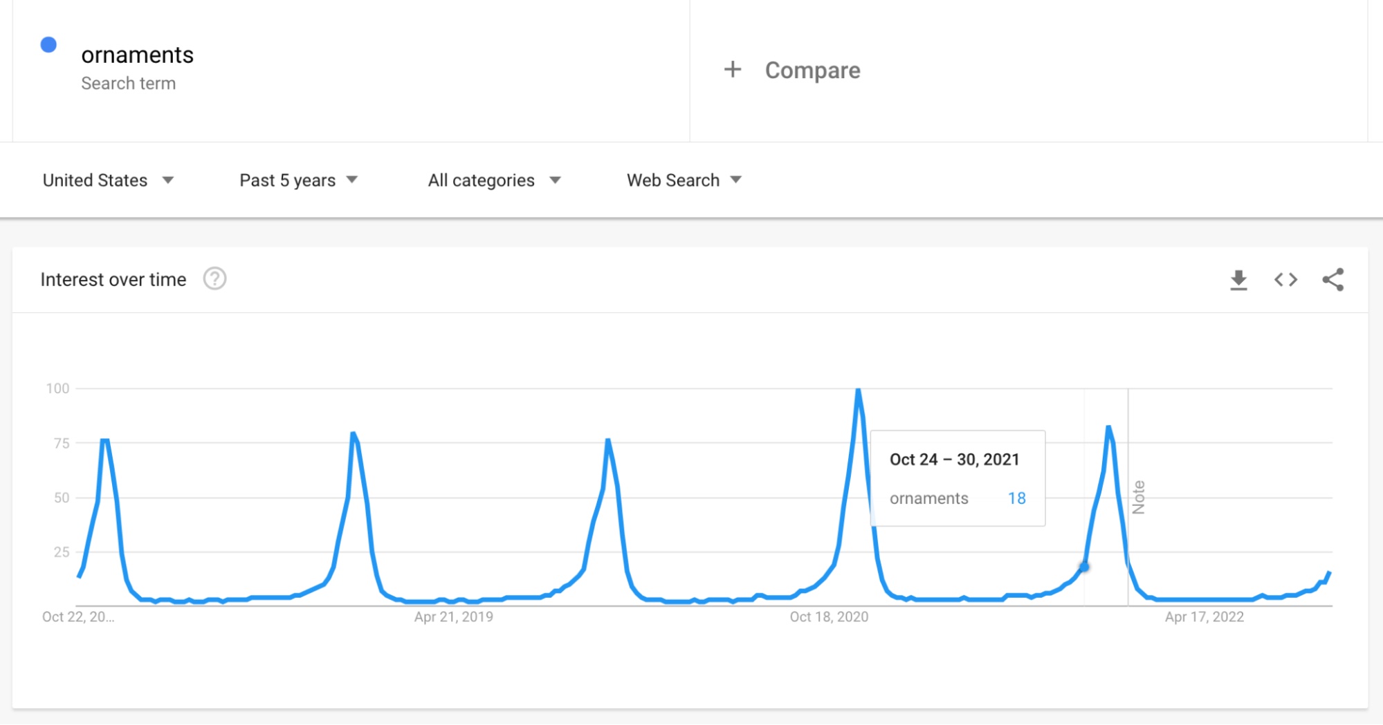 Google Trends is another great tool to identify the best timing for your seasonal content and its promo to start. For example, based on that tool, it looks like the interest in “ornaments” starts growing consistently mid-October, year after year: